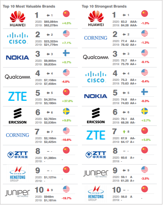 英國(guó)知名品牌評(píng)估機(jī)構(gòu)Brand Finance(英國(guó)品牌金融咨詢(xún)公司)發(fā)布《Telecoms 150 2020》年度報(bào)告,列出了全球十大最有價(jià)值和十大最強(qiáng)大的電信基礎(chǔ)設(shè)施品牌,中天科技同時(shí)位列兩榜第8名。