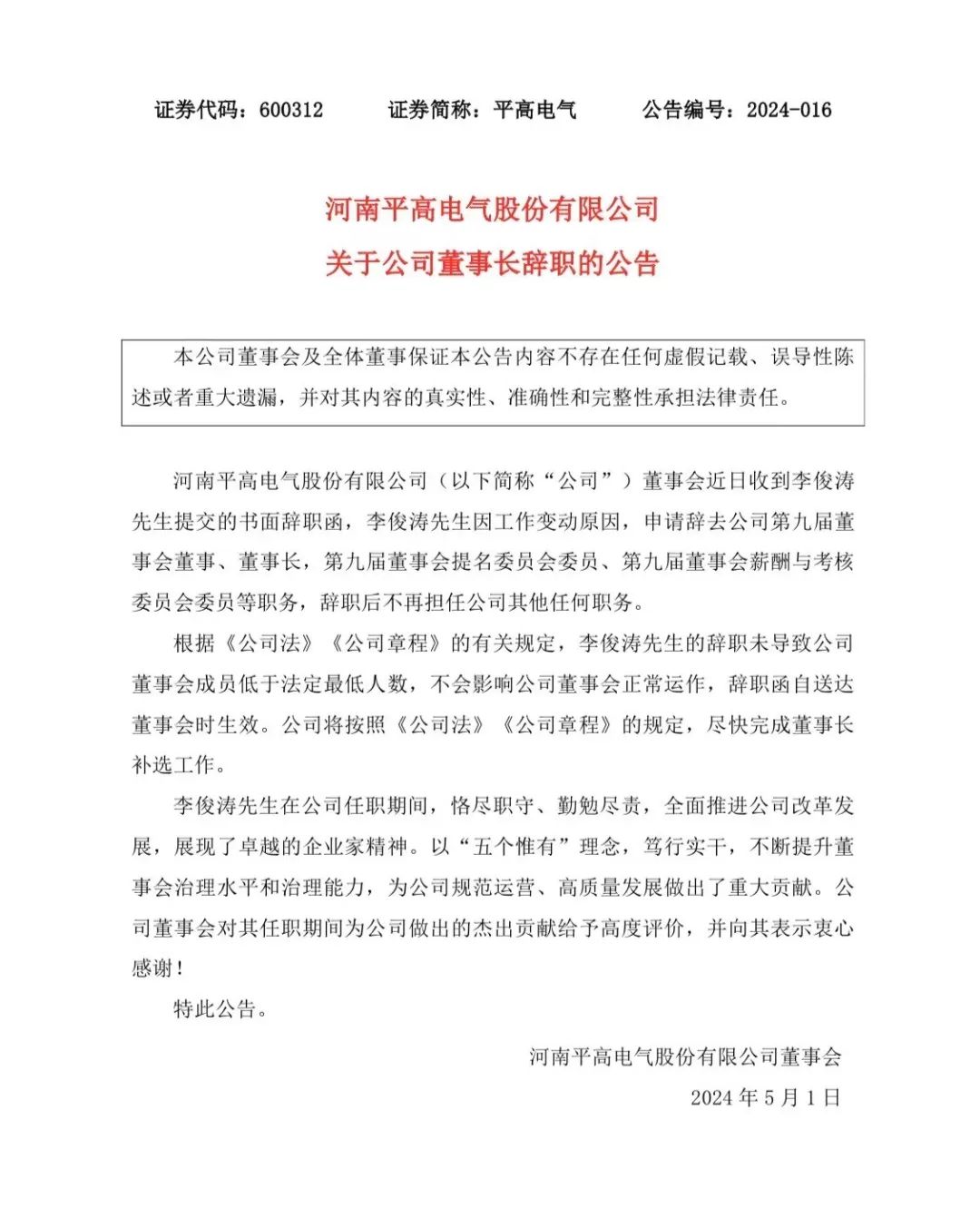 5月1日,平高電氣發(fā)布公告稱,公司董事會近日收到李俊濤先生提交的書面辭職函,李俊濤先生因工作變動(dòng)原因,申請辭去公司第九屆董事會董事、董事長,第九屆董事會提名委員會委員、第九屆董事會薪酬與考核委員會委員等職務(wù),辭職后不再擔(dān)任公司其他任何職務(wù)。