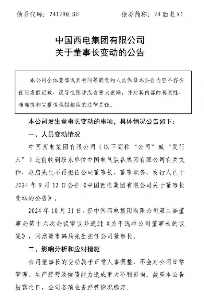 11月5日,中國西電集團(tuán)有限公司發(fā)布公告稱,此前收到股東單位中國電氣裝備集團(tuán)有限公司有關(guān)文件,趙啟不再擔(dān)任公司董事長、董事職務(wù),發(fā)行人已于9月12日公告《中國西電集團(tuán)有限公司關(guān)于董事長變動(dòng)的公告》。
