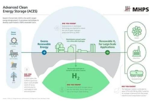 MHPS還通過(guò)猶他州高級(jí)清潔能源存儲(chǔ)(ACES)項(xiàng)目,開發(fā)了網(wǎng)格化大規(guī)模的可再生氫生產(chǎn)和存儲(chǔ)技術(shù)。ACES項(xiàng)目使用可再生能源通過(guò)電解生產(chǎn)氫氣。氫氣將在現(xiàn)場(chǎng)的地下鹽穴實(shí)現(xiàn)跨季節(jié)存儲(chǔ),并供給墨西哥灣沿岸的煉油廠。當(dāng)風(fēng)、光可再生能源發(fā)電受限時(shí),存儲(chǔ)的可再生氫可以直接發(fā)電。