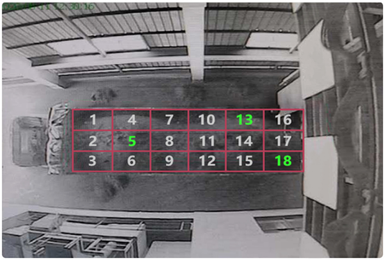 通過(guò)攝像頭的實(shí)時(shí)畫(huà)面,基于深度學(xué)習(xí)物體檢測(cè)車(chē)輛,捕捉貨車(chē)車(chē)廂上頂蓋平面,用線(xiàn)條等分,繪制18個(gè)子采樣區(qū)域,并對(duì)子區(qū)域進(jìn)行編號(hào),直觀展示采樣分布。