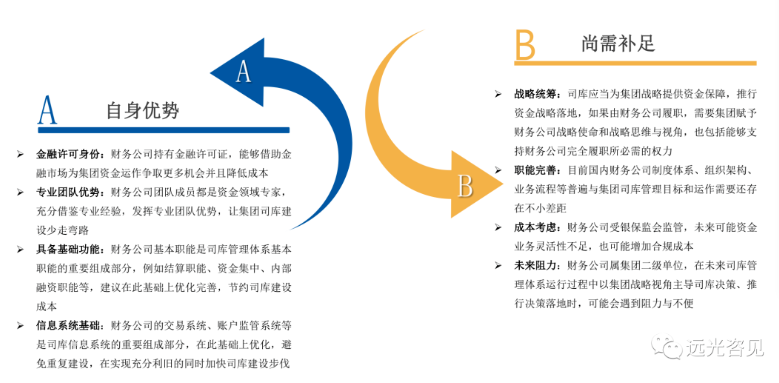 有不少企業(yè)會有困惑,是否可以以財務(wù)公司為基礎(chǔ)構(gòu)建司庫管理體系?這個不建議直接用“是\否”來回答,或許回答“部分可以”會比較適宜。從財務(wù)公司優(yōu)勢和可能存在的不足兩個角度進行簡要分析,如圖: