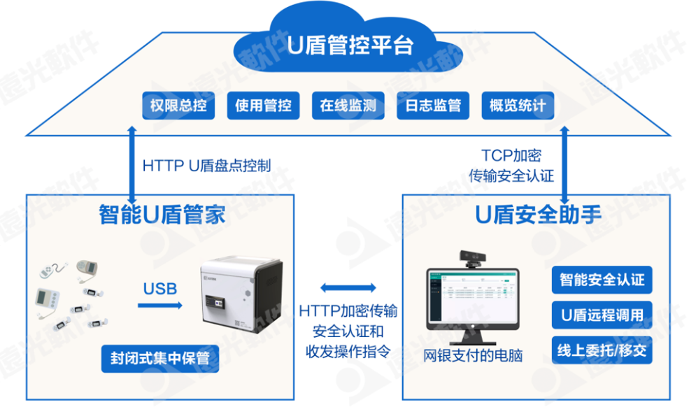基于以上問題,遠(yuǎn)光軟件推出了全新的U盾安全管控一體化解決方案,通過智能U盾管家、U盾管控平臺(tái)、U盾安全助手軟硬一體化的應(yīng)用,對(duì)企業(yè)各類銀行U盾進(jìn)行封閉保管、線上授權(quán)、安全認(rèn)證、遠(yuǎn)程調(diào)用、實(shí)時(shí)監(jiān)控、追蹤及統(tǒng)計(jì),實(shí)現(xiàn)了企業(yè)U盾“存放-使用-簽退”全鏈路線上閉環(huán)管理,提升U盾保管及使用的安全性,保障企業(yè)資金管理安全。