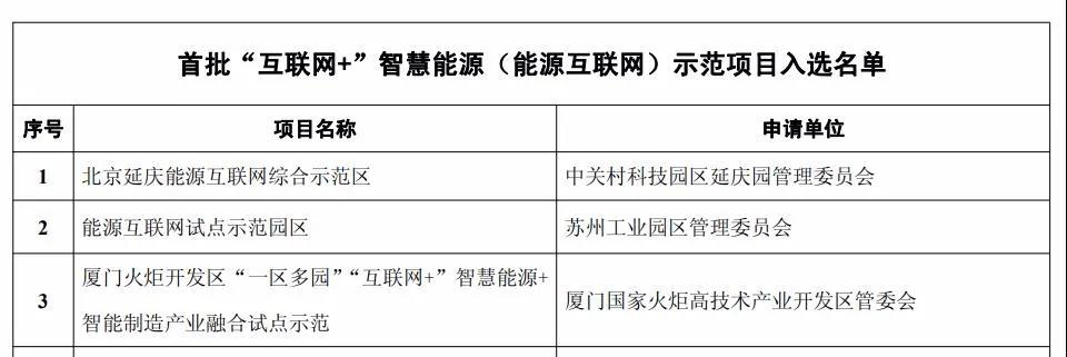 “廈門火炬開(kāi)發(fā)區(qū)‘一區(qū)多園’‘互聯(lián)網(wǎng)+’智慧能源+智能制造產(chǎn)業(yè)融合試點(diǎn)示范”項(xiàng)目屬于國(guó)家能源局首批“互聯(lián)網(wǎng)+”智慧能源(能源互聯(lián)網(wǎng))示范項(xiàng)目之一,項(xiàng)目牽頭單位為廈門國(guó)家火炬高技術(shù)產(chǎn)業(yè)開(kāi)發(fā)區(qū)管理委員會(huì),項(xiàng)目于2017年3月6日在國(guó)家能源局網(wǎng)站公示。