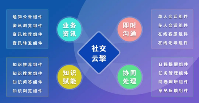 遠光社交云擎套件,含即時溝通、知識賦能、業(yè)務資訊、協(xié)同處理四大云擎組件,所有組件能夠與企業(yè)各類業(yè)務系統(tǒng)深度融合,以人為核心,以高效協(xié)同為根本,改變企業(yè)及組織傳統(tǒng)的互動與信息共享方式,破解業(yè)務協(xié)同互聯(lián)等難題,實現(xiàn)管理系統(tǒng)融合創(chuàng)新,助力管理快速社交化、智能化升級。