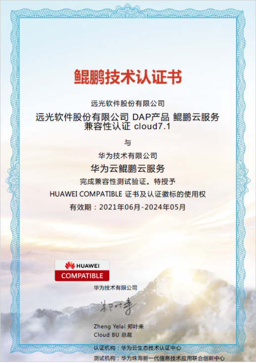 遠(yuǎn)光達(dá)普(YG-DAP)基于華為云的鯤鵬服務(wù)器,成功通過(guò)了性能測(cè)試、兼容性測(cè)試、安全性測(cè)試等,滿(mǎn)足鯤鵬兼容性認(rèn)證要求,驗(yàn)證了系統(tǒng)能夠應(yīng)對(duì)不同業(yè)務(wù)場(chǎng)景時(shí)所使用基于鯤鵬云服務(wù)的性能需求,證明了系統(tǒng)具有高度完整性、強(qiáng)大開(kāi)放性和兼容性,運(yùn)行穩(wěn)定,完全適配國(guó)產(chǎn)設(shè)備以及系統(tǒng)平臺(tái),滿(mǎn)足國(guó)產(chǎn)化安全可控的要求。