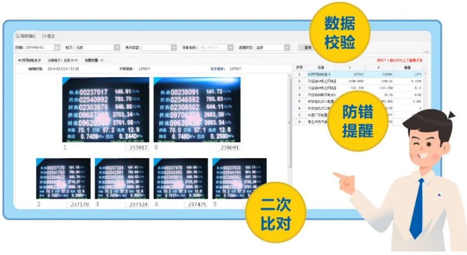 有些工作人員會擔(dān)心,萬一識別的時候數(shù)據(jù)錯誤了,可是我們又很難及時發(fā)現(xiàn),這可怎么解決?放心,系統(tǒng)對自動讀取的數(shù)據(jù)會首先進(jìn)行歷史數(shù)據(jù)對比校驗,對不符合預(yù)先設(shè)置范圍及條件內(nèi)的數(shù)據(jù),進(jìn)行防錯提醒,并由人工進(jìn)行二次對比審核,保證數(shù)據(jù)準(zhǔn)確。