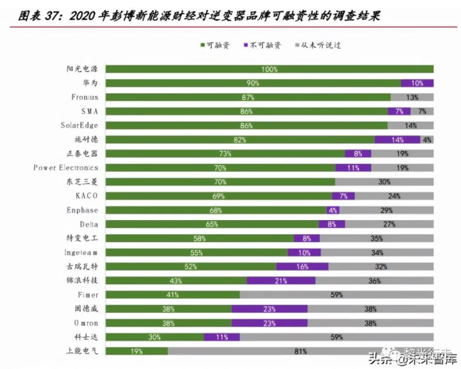 2020年彭博新能源財(cái)經(jīng)通過向可再生能源項(xiàng)目的投資方發(fā)放問卷等形式,對逆變器品牌的可融資性進(jìn)行了調(diào)查。排名較高的品牌意味著更易幫助項(xiàng)目開發(fā)商獲得銀行融資,利于綁定長期客戶群體;另一方面說明該品牌逆變器在產(chǎn)品質(zhì)量、運(yùn)行表現(xiàn)、售后服務(wù)支持和長期可靠性方面表現(xiàn)突出,利于海外布局的拓展。陽光電源以100%的得票率當(dāng)選“全球最具融資價(jià)值的逆變器品牌”,華為位居第2名,共有9家中國企業(yè)上榜。重要的是,該調(diào)查結(jié)果展現(xiàn)出國內(nèi)逆變器企業(yè)在海外擴(kuò)張業(yè)務(wù)的過程中,品牌價(jià)值得到提升,逐步得到海外投資方的認(rèn)可。