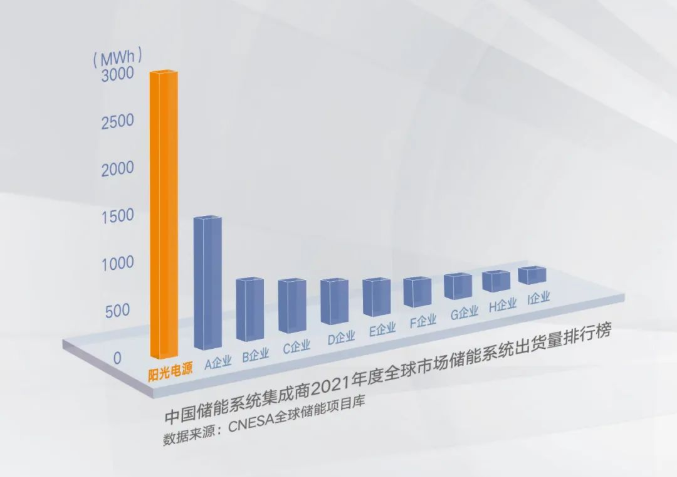 本次排名以全球儲(chǔ)能項(xiàng)目庫(kù)為依據(jù),對(duì)中國(guó)主流儲(chǔ)能系統(tǒng)供應(yīng)商發(fā)貨量進(jìn)行研究,陽(yáng)光電源憑借2021年儲(chǔ)能系統(tǒng)全球發(fā)貨3GWh、儲(chǔ)能變流器全球發(fā)貨2.5GW,再次贏得雙項(xiàng)第一。