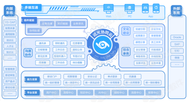 遠(yuǎn)光協(xié)同云以移動端協(xié)同為核心,融合內(nèi)外部應(yīng)用,支持企業(yè)以搭積木形式取用文化建設(shè)、溝通協(xié)作、綜合事務(wù)等多類應(yīng)用,為企業(yè)構(gòu)建社交化、移動化、云端化、智能化的協(xié)作創(chuàng)新生態(tài)圈。