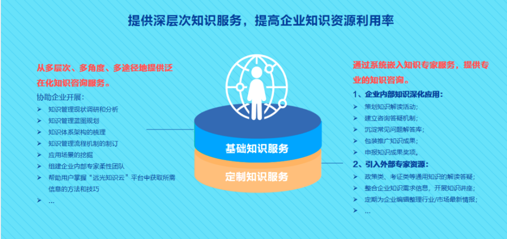 除了提供全方位的平臺支撐外,遠(yuǎn)光知識云同時還提供“三位一體知識服務(wù)”:內(nèi)容資源服務(wù)、知識咨詢服務(wù)、知識運(yùn)營服務(wù)。幫助企業(yè)持續(xù)提升知識管理能力,充分發(fā)揮知識管理價值,提升企業(yè)核心競爭力。