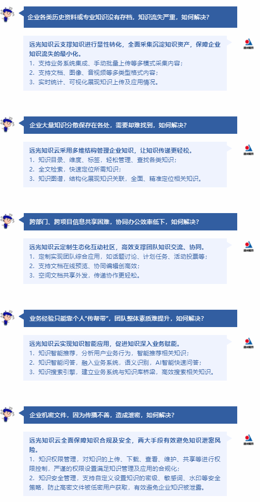 對于企業(yè)知識管理場景中常見的難題,遠(yuǎn)光知識云提供以下解決方案,全面支撐企業(yè)知識高效、安全管理與應(yīng)用。