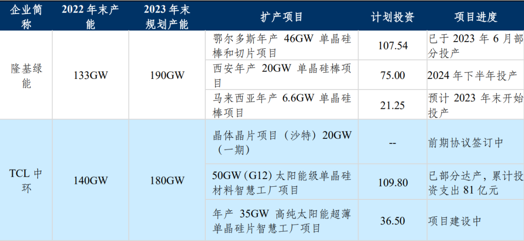 硅片雙龍頭擴產(chǎn)情況;來源:公司公告