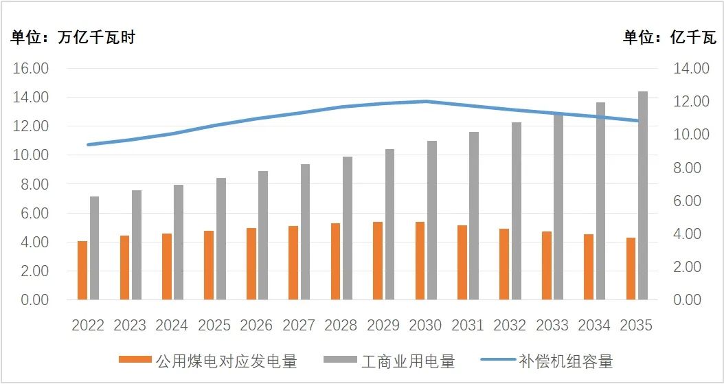 圖1 公用煤電對(duì)應(yīng)發(fā)電量及工商業(yè)用電量、補(bǔ)償機(jī)組容量預(yù)測(cè)趨勢(shì)(未來年度數(shù)據(jù)為作者個(gè)人分析預(yù)測(cè)值,其中煤電容量數(shù)據(jù)為年內(nèi)平均值而非期末時(shí)點(diǎn)值)