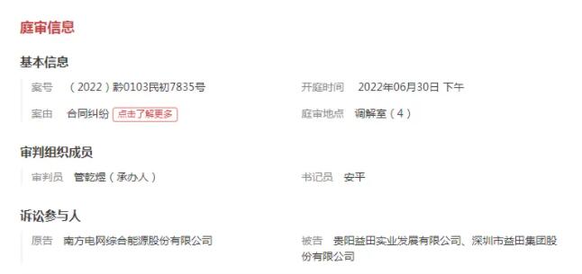 6月28日,深圳市益田集團股份有限公司新增開庭公告,開庭時間為2022年06月30日 15:00,案號為(2022)黔0103民初7835號,案由系合同糾紛,上訴人/原告為南方電網(wǎng)綜合能源股份有限公司,被上訴人/被告為貴陽益田實業(yè)發(fā)展有限公司,深圳市益田集團股份有限公司,法院為貴州省貴陽市云巖區(qū)人民法院。