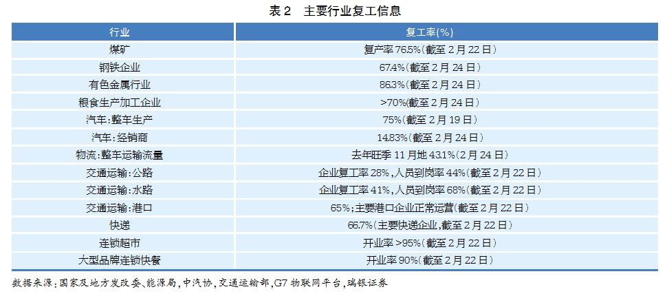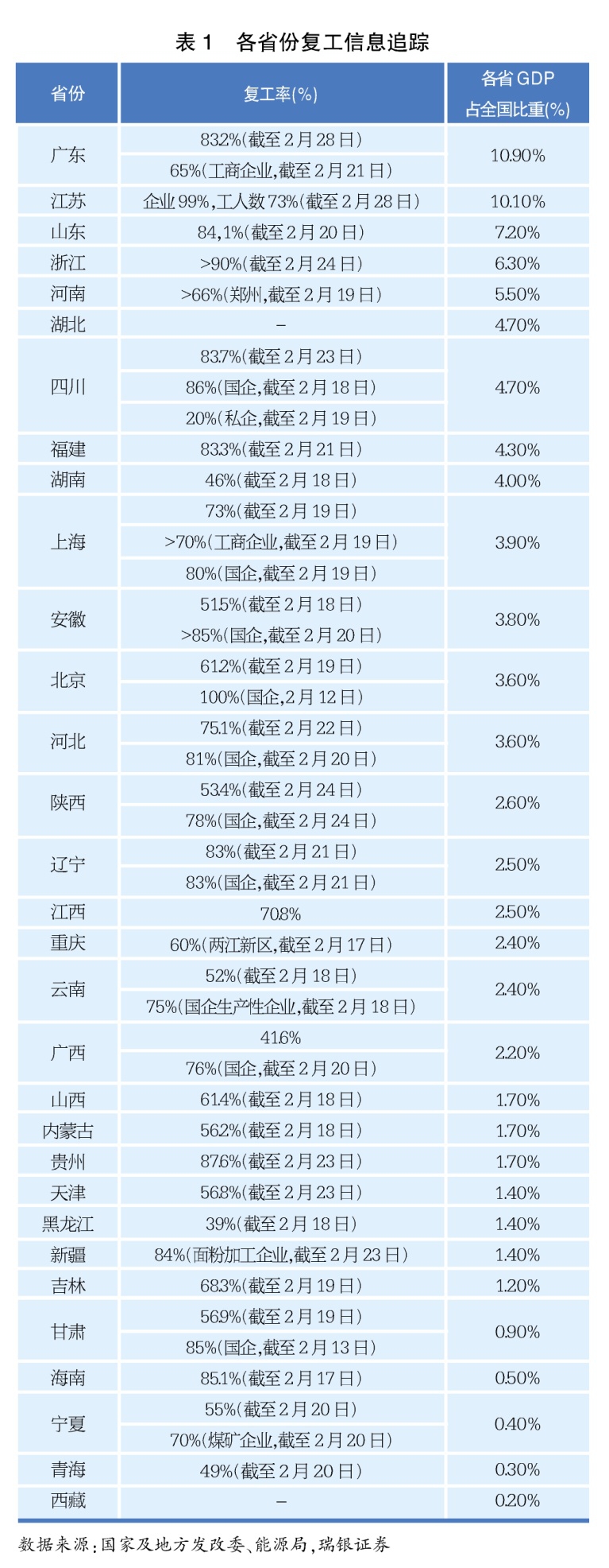 新冠疫情暴發(fā)以來,為防止疫情擴(kuò)散,除去武漢等13個(gè)城市封城以外,大多數(shù)省份選擇延遲復(fù)工復(fù)產(chǎn)、嚴(yán)格實(shí)施出行管控。雖然自2月以來,國(guó)內(nèi)政策重心已由防控疫情逐漸向企業(yè)復(fù)工傾斜,各地區(qū)開始分層分級(jí)推動(dòng)有序復(fù)工,但復(fù)工效率不及預(yù)期。由于地方隔離措施無法統(tǒng)一,返工人員明顯不足、交通物流依然不暢、產(chǎn)業(yè)鏈上下游尚未匹配、口罩等防疫物資持續(xù)不足,因此地區(qū)公布的企業(yè)復(fù)工數(shù)據(jù)僅代表企業(yè)獲得復(fù)工許可,產(chǎn)能實(shí)質(zhì)上未得到充分利用,“復(fù)工難復(fù)產(chǎn)”問題依然嚴(yán)峻。真正的全面復(fù)工可能需要到3月中下旬甚至更晚,而服務(wù)業(yè)的復(fù)工進(jìn)度更慢(注1)(見表1)。