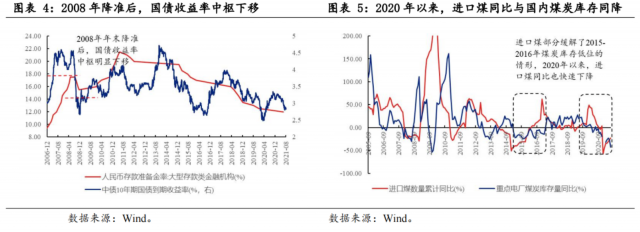 與之形成對比的是2008年的煤炭行情,這輪行情主要由流動性和需求驅(qū)動,煤炭股與煤炭價格相關(guān)性相對較小。2008年10月至12月三次降準(zhǔn),國債收益率中樞明顯下移,流動性驅(qū)動下,煤炭股起步早于煤炭價格1個月,并且在煤炭股快速上漲期間,煤炭價格僅小幅上漲不足6%。