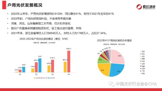 2022年9月27日,在中國(guó)光伏行業(yè)協(xié)會(huì)的指導(dǎo)和國(guó)內(nèi)領(lǐng)先的分布式戶用企業(yè)支持下,由索比光伏網(wǎng)主辦的“2022年中國(guó)戶用光伏品牌大會(huì)暨中東部省份分布式項(xiàng)目開發(fā)研討會(huì)”在浙江寧波召開。索比光伏網(wǎng)副主編尹也澤對(duì)光伏供應(yīng)鏈與分布式應(yīng)用市場(chǎng)進(jìn)行了回顧展望。尹也澤副主編分析,整體看,今年全年全國(guó)光伏發(fā)電新增裝機(jī)有望超過90GW,其中分布式光伏仍將占據(jù)“半壁江山”。