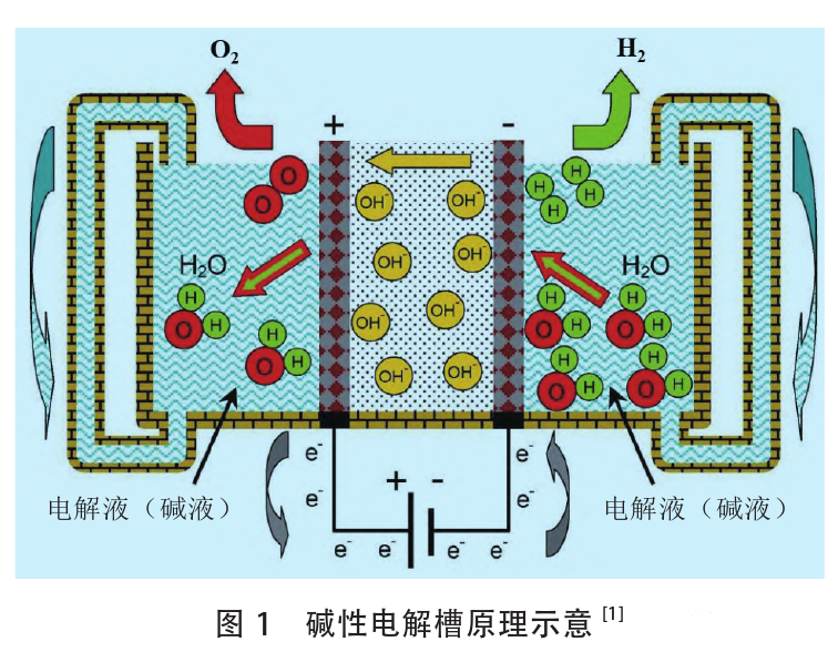 堿性電解槽的工作原理如圖1所示。電池由兩個(gè)電極組成,兩個(gè)電極由氣密隔膜分開。電池裝配時(shí)浸沒在高濃度的堿性液體電解質(zhì)KOH(20%~30%)中,使離子電導(dǎo)率最大化,NaOH和NaCl溶液也可作電解液,但不常用,電解液的主要缺點(diǎn)是具有腐蝕性。電解槽的工作溫度為65~100℃,電解槽陰極產(chǎn)生氫氣,生成的OH–通過(guò)隔膜流向陽(yáng)極,在陽(yáng)極表面重新結(jié)合產(chǎn)生氧氣。先進(jìn)的堿性電解槽適合大規(guī)模制氫,一些制造商制造的堿性電解槽在(500~760Nm3/h)具有非常高的產(chǎn)氫能力,相應(yīng)的耗電量為2150~3534kW。