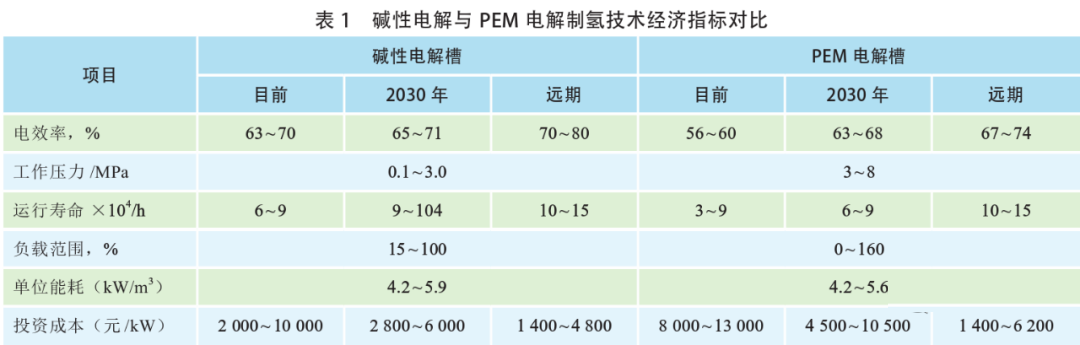 我國(guó)以可再生能源(如風(fēng)電、光伏、水電)進(jìn)行電解水制氫,電價(jià)控制在0.25元/kWh以下時(shí),制氫成本具有相對(duì)經(jīng)濟(jì)性(15.3~20.9元/kg)。堿性電解與PEM電解制氫技術(shù)經(jīng)濟(jì)指標(biāo)見表1。