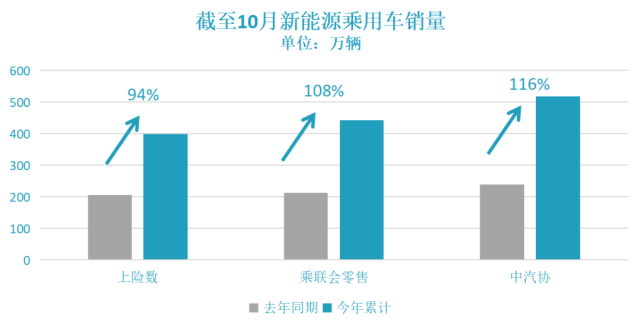 終端統(tǒng)計(jì)的上險(xiǎn)數(shù)更為直接反映了市場狀況,1-10月總上險(xiǎn)新能源乘用車399.47萬輛,同比增幅也達(dá)到了94%。