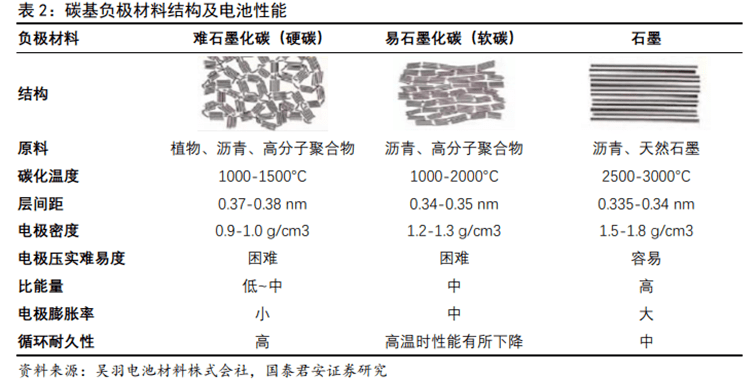 硬碳占據(jù)負極主流,改善首周循環(huán)效率為商業(yè)化關(guān)鍵。硬碳材料由于高比容量(300 mAh/g左右)、低儲鈉電壓(平臺段電壓在0.1V左右)、長循環(huán)壽命、來源廣而被認為是鈉離子電池最具商業(yè)化潛力的負極材料。目前,商業(yè)化的鈉離子電池所使用的負極幾乎都是硬碳,硬碳比石墨更易合成。
