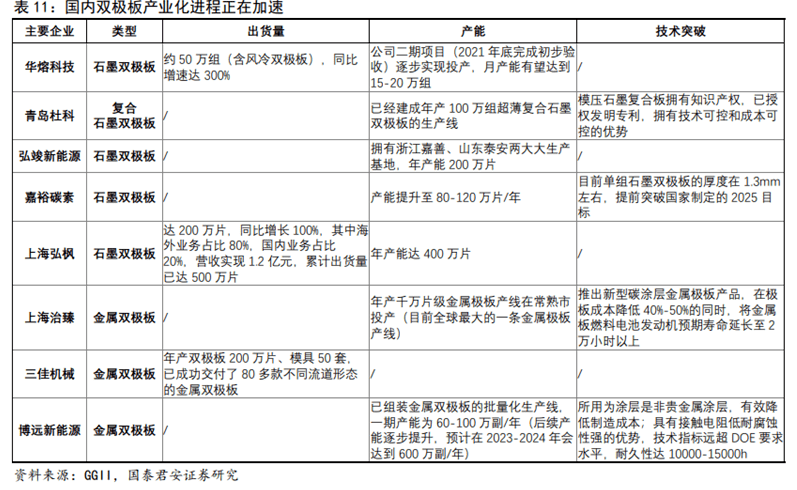 國內產業(yè)化進程正在加速:據(jù)GGII統(tǒng)計,2021年期間,國內主流雙極板企業(yè)出貨量增長顯著,金屬雙極板領域已出現(xiàn)單個企業(yè)單個客戶出貨達百萬片級別的現(xiàn)象;石墨板市場各家出貨也均有較大增長,表現(xiàn)明顯的是原萬片級出貨企業(yè)的出貨量級達到10萬片以上,頭部企業(yè)的出貨更是達到了50萬片/年以上。