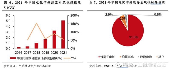 我國電化學(xué)儲能裝機規(guī)模持續(xù)高速增長,其中鋰電池儲能規(guī)模占比超九成。2021年,中國電化學(xué)儲能累計裝機規(guī)模5.1GW,同比增長56.5%,2016-2021年CAGR高達(dá)79.3%。其中,鋰離子電池儲能技術(shù)裝機規(guī)模4.7GW,裝機規(guī)模占比91.0%;鉛蓄電池儲能裝機規(guī)模0.3GW,占比5.5%;液流電池儲能技術(shù)裝機規(guī)模0.1GW,占比2.9%。