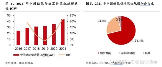 我國儲能市場穩(wěn)步擴容,電化學(xué)儲能份額增長明顯。在新能源發(fā)電規(guī)模大幅增長的推動下,我國儲能裝機規(guī)模一直保持高速增長的趨勢。根據(jù)國家能源局?jǐn)?shù)據(jù),2021年中國儲能市場累計裝機功率位居全球第一,為43.4GW,同比增長21.9%,2016-2021年儲能累計裝機量年均復(fù)合增長率為12.3%。2021年我國抽水蓄能新增裝機5.2GW,占比71.1%;電化學(xué)儲能新增裝機1.8GW,占比24.9%,較2020年占比9.2%增幅較大,電化學(xué)儲能市場份額增長明顯。