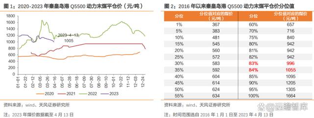 近期煤價持續(xù)回落,但仍處于歷史較高分位。2023 年 4 月 13 日秦皇島 Q5500 動力末煤平倉價為 1005 元/噸,較年內(nèi) 1 月份高點(1215 元/噸)下降 17.28%,較 2022 年以來峰值(1664元/噸)已回落 39.60%。歷史對比來看,當(dāng)前秦皇島 Q5500 動力末煤平倉價位于 2016 年以來的 83%~84%分位高點,仍處于歷史高位。