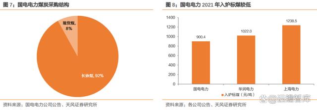 此外,上市公司國電電力充分利用集團(tuán)優(yōu)勢,長協(xié)煤占比高,有效緩解燃料成本壓力。公司充分利用國家能源集團(tuán)“煤電路港航”一體化產(chǎn)業(yè)協(xié)同優(yōu)勢,提升內(nèi)部優(yōu)質(zhì)長協(xié)煤炭資源比例及兌現(xiàn)率。2021 年,公司共采購煤炭 1.91 億噸,其中長協(xié)煤總量 1.75 億噸,占比92%。公司把握采購結(jié)構(gòu)和節(jié)奏,優(yōu)化采購煤種和熱值,深入開展精細(xì)化配煤摻燒;在燃料智能化、智能發(fā)電、電力安全生產(chǎn)標(biāo)準(zhǔn)化等方面,開展了很多前沿探索,積累了很多成果經(jīng)驗,管控水平行業(yè)領(lǐng)先。從 2021 年入爐標(biāo)煤來看,公司僅為 900.4 元/噸,明顯處于行業(yè)較低水平。