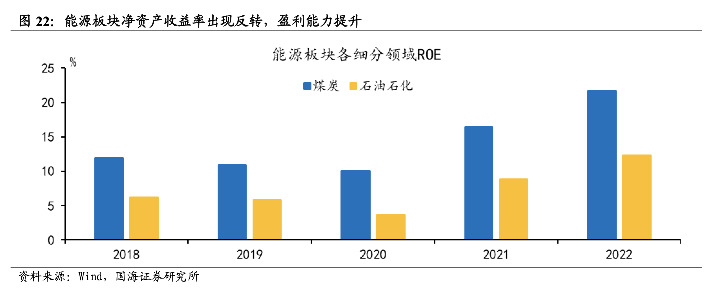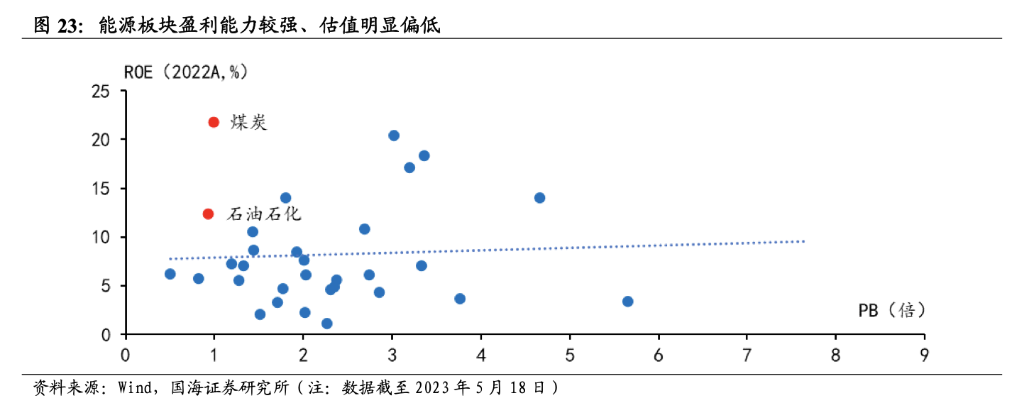 國海證券6月8日研報(bào)表示,能源板塊中上市公司擁有較為優(yōu)質(zhì)的基本面和偏低的市場估值,處于優(yōu)質(zhì)資產(chǎn)被低估的狀態(tài)。根據(jù)國海證券6月8日研報(bào)測算,截止到5月24日,石油石化、煤炭、公用事業(yè)2022年全年的ROE分別為12.32%、21.74%、5.59%,盈利能力較強(qiáng),且PB十年分位分別為 8.3%、35.9%、37.8%,能源是優(yōu)質(zhì)資產(chǎn)被低估的主要領(lǐng)域,調(diào)整過后仍具備性價(jià)比。