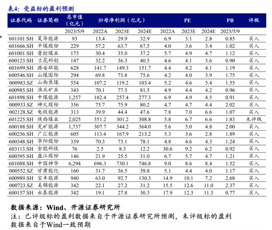 根據(jù)開源證券梳理,煤企四種能源轉(zhuǎn)型途徑分別為,高分紅兼具高彈性的雙重受益標(biāo)的(前四再疊加高成長):山西焦煤、廣匯能源、兗礦能源、潞安環(huán)能、山煤國際;經(jīng)濟(jì)復(fù)蘇及冶金煤彈性受益標(biāo)的:平煤股份、淮北礦業(yè)(含轉(zhuǎn)債)、神火股份(煤鋁);穩(wěn)健高分紅受益標(biāo)的:中國神華、陜西煤業(yè);中特估預(yù)期差最大受益標(biāo)的:中煤能源;能源轉(zhuǎn)型受益標(biāo)的:華陽股份、美錦能源(含轉(zhuǎn)債)、電投能源、永泰能源。