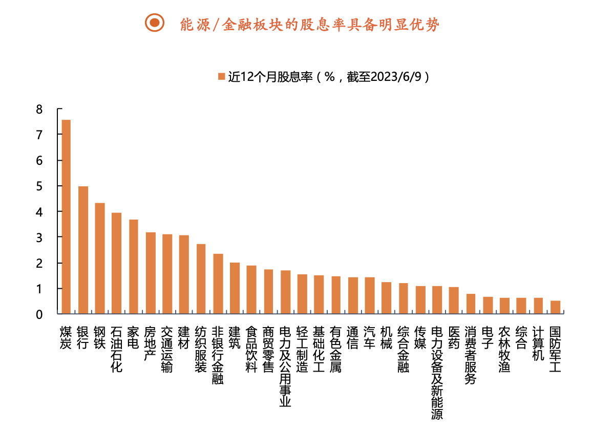 與此同時(shí),平安證券研報(bào)指出,在“中特估+分紅”細(xì)分主線下能源領(lǐng)域有望顯著受益。根據(jù)近12個(gè)月股息率(截至2023/6/9),能源股息率具備明顯優(yōu)勢,煤炭、鋼鐵、石油化工股息率均位列前五。