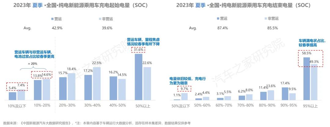 從充電開始電量上看,在夏季營運(yùn)與非營運(yùn)車輛均有相當(dāng)比例的車輛存在電池過放有害電池健康的現(xiàn)象,這一情況的比例較春季明顯增加。同時(shí),在剩余電量在50%以上就開始充電的車主數(shù)量較春季有明顯下降,營運(yùn)車輛與家用車輛車主對里程焦慮感有所減弱。
