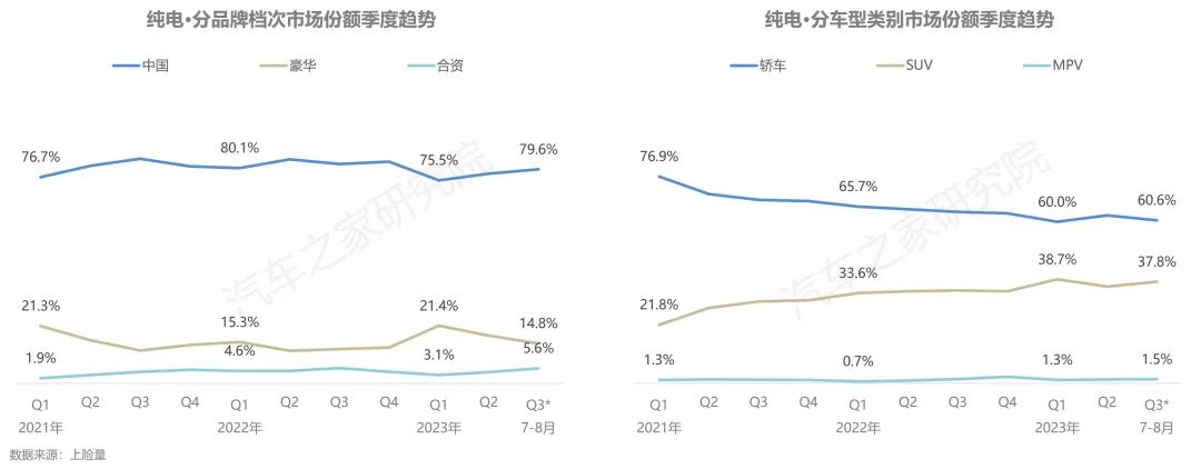 而從車型的角度上看,新能源純電市場產(chǎn)品結(jié)構(gòu)暫時(shí)趨于穩(wěn)定,轎車占據(jù)六成的市場份額,是絕對的主力車型,SUV車型占據(jù)近40%的市場空間,但發(fā)展態(tài)勢正在處于上升通道之中,MPV車型市場空間持續(xù)穩(wěn)定在相對微小的水平。