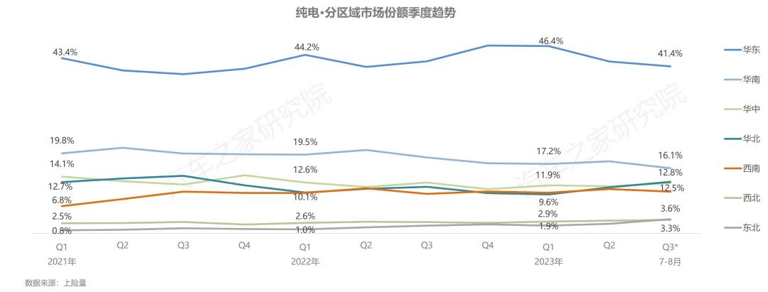 從區(qū)域角度上看,以長三角為代表的華東地區(qū)是中國發(fā)展的重要引擎,匯聚多個(gè)經(jīng)濟(jì)發(fā)達(dá)的省、市,更高的本地居民收入與完善的充電基礎(chǔ)設(shè)施配套,促使當(dāng)?shù)叵M(fèi)者對新能源純電汽車更加旺盛的購車需求,其市場份額長期保持在40%以上,成為新能源純電車型最為重要的區(qū)域市場;華南地區(qū)以16%左右的份額位居第二;華中、華北、西南市場占比均在12%左右,份額十分相近;西北、東北市場占比尚不足5%。