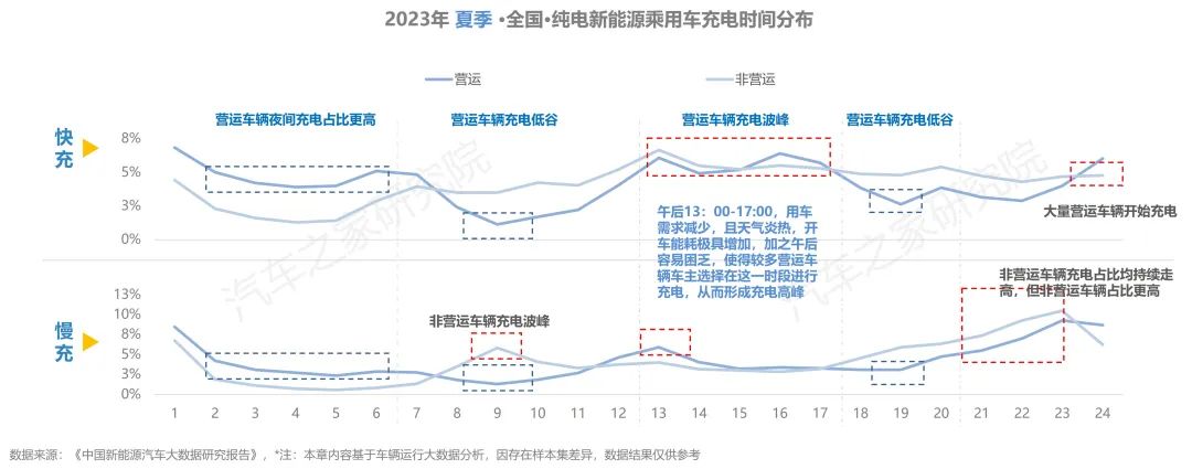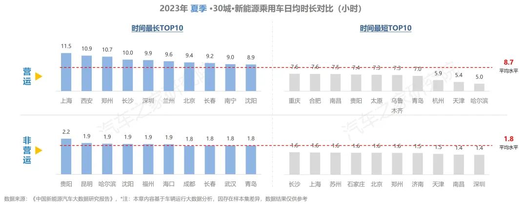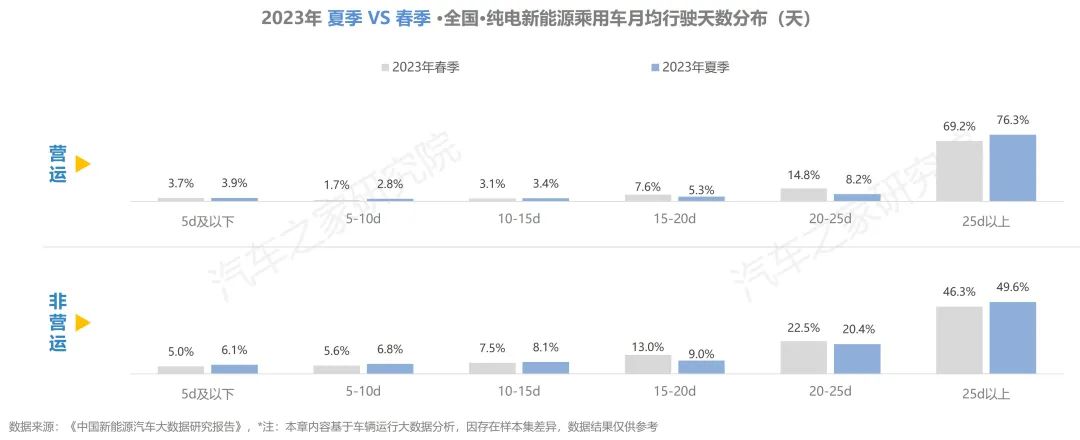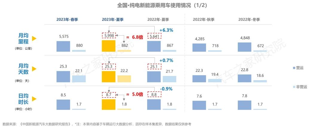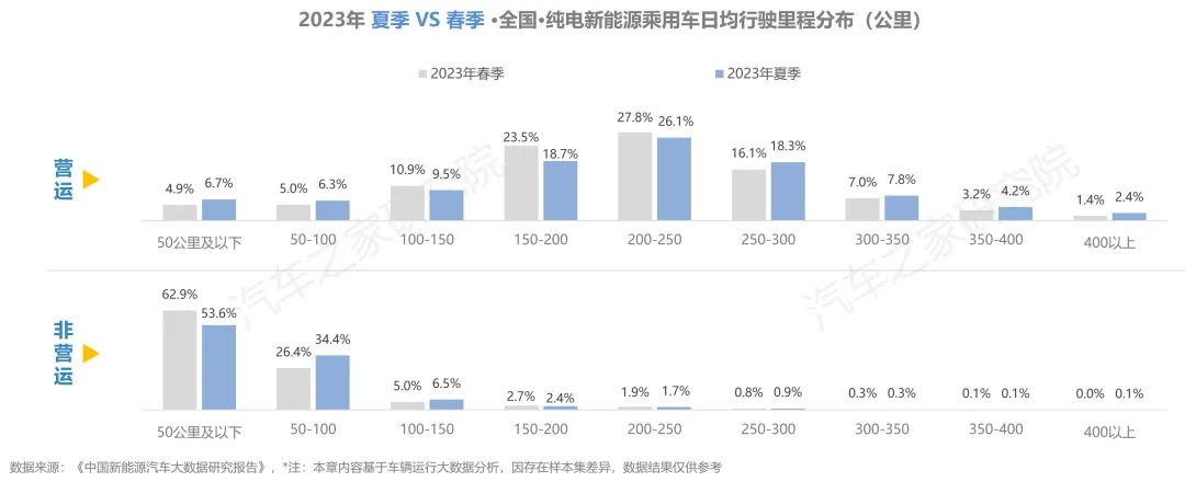 與去年同期相比,純電車輛在行駛里程有所增加,在出行天數(shù)與行駛時(shí)長方面,同去年夏季相比大體持平。而從不同車輛性質(zhì)對比上看,營運(yùn)車輛的使用強(qiáng)度遠(yuǎn)超非營運(yùn)車輛,兩者在行駛里程方面相差超6倍,在日均時(shí)長則亦有近5倍的差距。