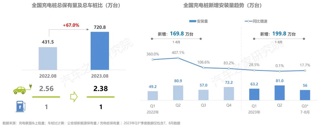 截止2023年8月,全國充電基礎(chǔ)設(shè)施累計(jì)數(shù)量為720萬臺,同比增加67.0%,車樁比為2.38,較去年同期與今年二季度的2.43均繼續(xù)下降。從充電設(shè)施建設(shè)上看,今年1-8月,充電樁新增安裝近200萬臺,新增安裝數(shù)量超越去年同期,7-8月充電樁安裝56萬臺,與今年二季度相比增速再次抬頭。