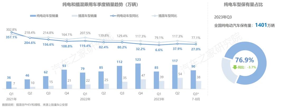 從新能源市場發(fā)展的趨勢上看,隨著技術(shù)的日漸成熟與明星車型的不斷涌現(xiàn),插混及增程車型的市場銷量增速長期處于領(lǐng)跑位置,純電車型市場增速相對較弱。而從絕對增量與存量兩個(gè)角度上看,新能源市場的大部分份額仍由純電車型所占據(jù),但市場正處于被緩慢的蠶食之中,目前全國純電動汽車保有量為1400萬輛,占全部新能源車保有量的近77%。