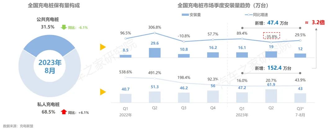 從結(jié)構(gòu)上看,私樁是目前新能源汽車補(bǔ)能的主要方式,占據(jù)充電樁近7成的保有量,而且發(fā)展增速更快。2023年1-8月,公共充電樁新增安裝47.4萬臺,7-8月安裝12萬臺,新增安裝量已超過去年整體Q3增量規(guī)模,恢復(fù)上行態(tài)勢,但其增量水平與整體規(guī)模,同私人充電樁規(guī)模相比差距增大。