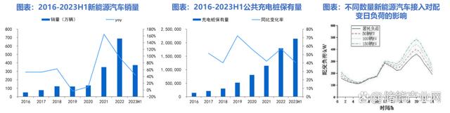 充電樁保有量隨新能源汽車快速提升,改變配電網(wǎng)形態(tài)。截至2023H1,我國公共充電樁保有量為214.86萬臺,同比+40.63%。2023H1,新能源汽車銷量同比+44.13%,保持快速增長,可以預(yù)見未來隨新能源汽車銷量繼續(xù)快速提升,充電樁保有量將持續(xù)增加。充電樁的大量增加將對配電網(wǎng)產(chǎn)生沖擊,相比于常規(guī)交流充電樁,快充直流樁由于功率更大、充電時間更短,產(chǎn)生沖擊更大。
