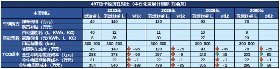 在最近的電動汽車百人會上,中石化的劉會友,展示了一張氫能重卡的經(jīng)濟性測算表。香橙會也有類似的測算,結(jié)果大差不差。結(jié)論都是,目前氫燃料重卡,處在一個微妙的盈虧平衡點上。從5年全生命周期的角度,已經(jīng)跟燃油重卡打平。但是,從終端使用者的角度,目前還沒有感受到。這個時候,需要政策往前推一把。
