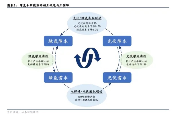 華泰證券最近有篇報告,畫了一張光伏和綠氫成本聯(lián)動的圖。核心的意思就是光伏降本遵循摩爾定律,而綠氫由光伏電解水制成,光伏降本會帶來綠氫成本的不斷下降,隨著綠氫成本的下降,就會解鎖越來越多的應(yīng)用,反過來又會帶動光伏的需求。這是一個循環(huán)。