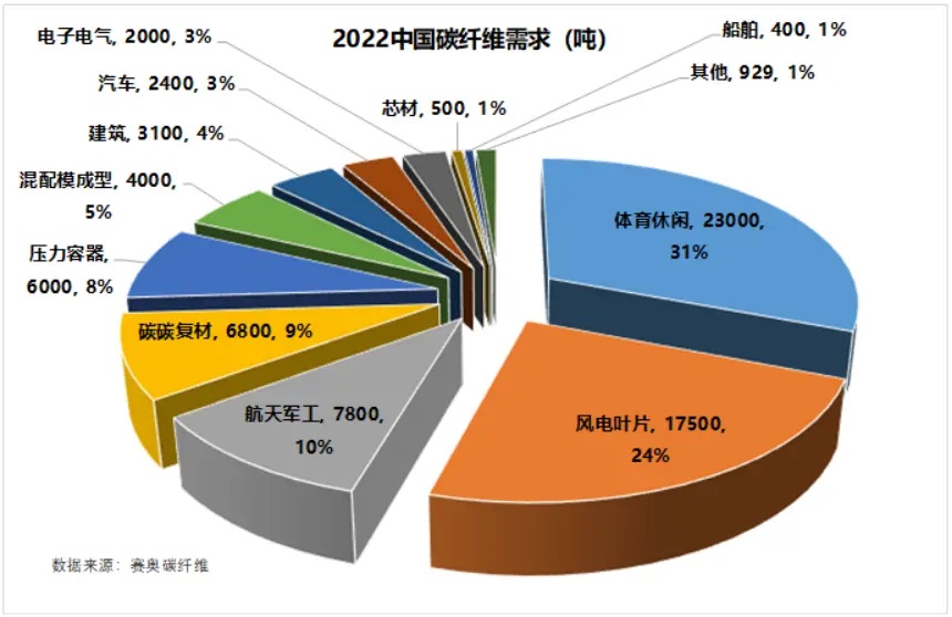 從應(yīng)用領(lǐng)域看,中國碳纖維需求的大頭是體育休閑,主要是一些釣魚竿、羽毛球網(wǎng)球拍之類的,2.3萬噸,占到需求的31%;其次是風(fēng)電葉片,1.75萬噸,占24%;再次航天軍工,這是碳纖維最早的應(yīng)用領(lǐng)域,7800噸占10%。其他還有碳碳復(fù)材、壓力容器等。