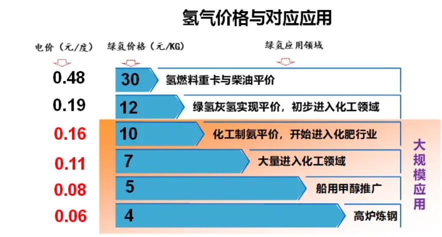 當(dāng)光伏電價降到0.19元每度時,對應(yīng)的綠氫價格是12元每公斤,這個時候的綠氫價格跟最便宜的煤制氫價格打平,一些單獨需要氫氣的化工流程,可以選擇綠氫,雖然整體應(yīng)用并不多。