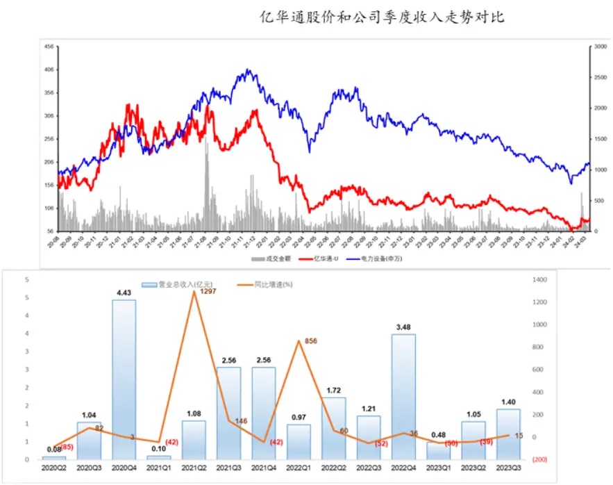 說到股價,讓我們先看億華通,這個燃料電池系統(tǒng)的龍頭。自2020年上市之后,公司的收入雖然增速一般,但還是跟著電力設(shè)備行業(yè)漲了很長一段時間,一直到2022年初見頂,然后就是隨著行業(yè),股價一路向下。當(dāng)然從收入增速上看,2022、2023兩年,收入同比增速顯然是下臺階的。原因就是雖然燃料電池系統(tǒng)的銷量是漲的,但是架不住單價下的太快,2020年單KW還能有個1.5-2萬,到了2023年就只有3000,這個降幅顯然太快了。