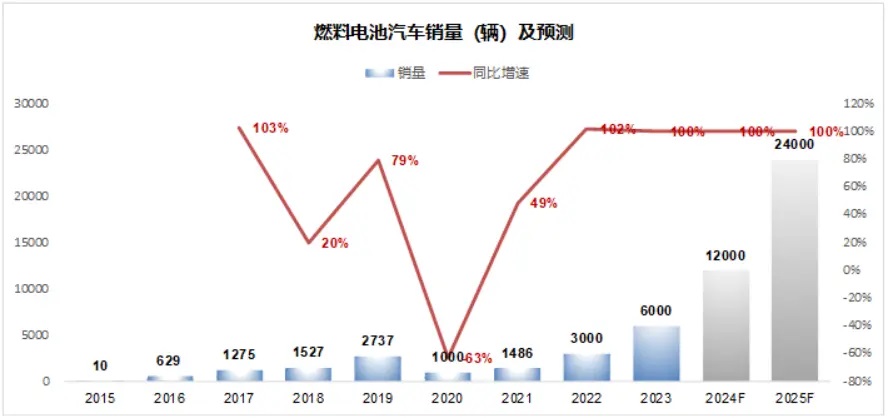 假如到2025年完成5萬輛的保有量,未來兩年需要燃料電池汽車銷量翻倍,2024年1.2萬輛,2025年2.4萬輛。市場上很多人質(zhì)疑這個目標(biāo)是不是能完成。