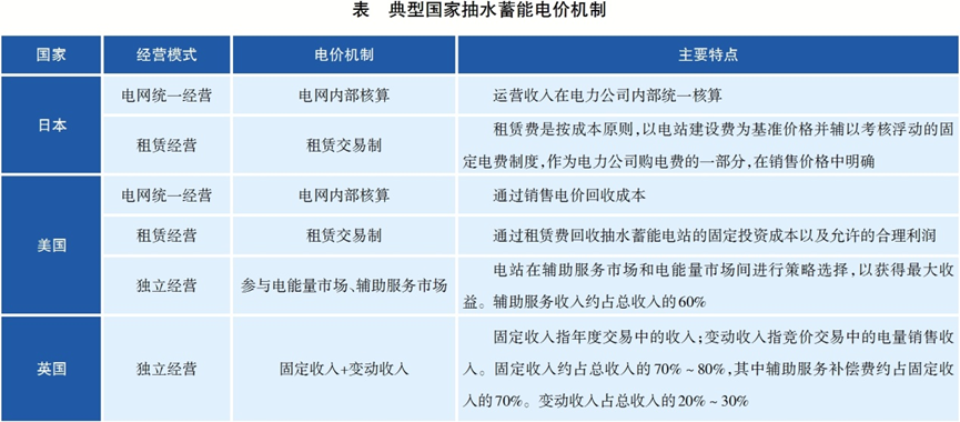 現(xiàn)階段,日本抽水蓄能電站主要采用租賃制(電源開發(fā)商參與)和內部核算制(電力公司主導);美國則以電網統(tǒng)一運營模式為主(抽蓄電站約占70%),輔以租賃運營和少量獨立運營,直接參與電力市場的比例較低;英國抽水蓄能電站雖然總體規(guī)模有限,但其高度市場化的發(fā)電側環(huán)境使其能夠作為獨立成員參與市場,其收入明確區(qū)分為年度交易的固定收入與競價交易的變動收入兩部分,構成典型的兩部制電價模式(見表)。