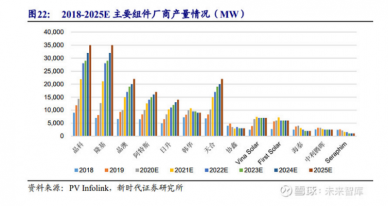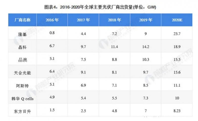 圖表2:我國光伏組件發(fā)展階段2016-2020年,全球主要廠商的組件出貨量不斷提升。2020年,隆基股份組件出貨量約為23.7GW,同比2019年增長163.33%,躍升至行業(yè)首位。同時,晶科、晶澳等龍頭組件廠商的出貨量也實現(xiàn)了超過30%的增長。廠商擴張產能主要為滿足下游光伏裝機容量的增加。